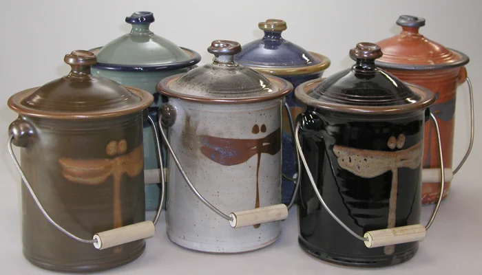 Having studied mechanical engineering at Queen’s University in Kingston, Ontario and ceramics at Sheridan College School of Crafts and Design has positioned Richard to make extremely comfortable and functional pottery for everyday use. Residing in Dundas, ON., he is known for his signature dragon fly motif on his table ware pottery and for his large stoneware kitchen compost pail design.